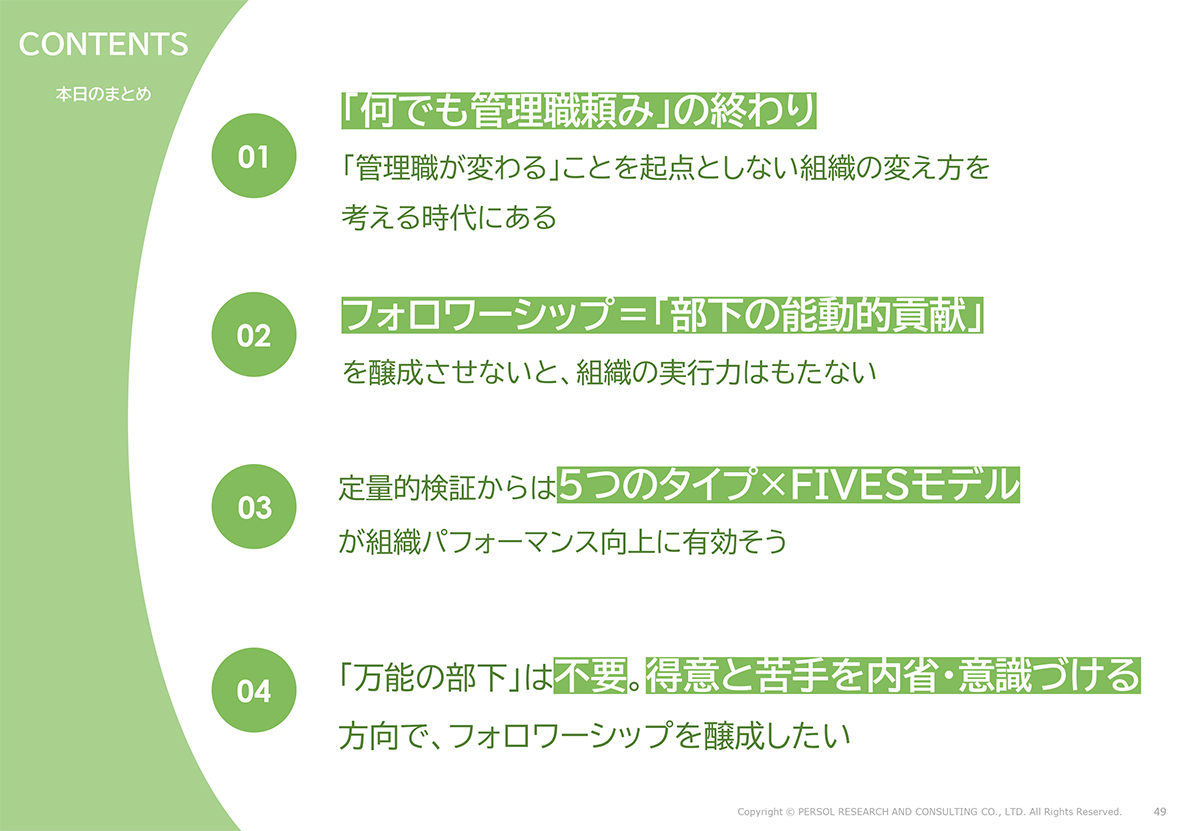 そのひとつがフォロワーシップです。フォロワーシップに関する調査から得たヒントは、フォロワーは5つのタイプ「自己成長タイプ」「職人タイプ」「気づかいタイプ」「まとめ役タイプ」「批判者タイプ」があること。そして、5つのフォロワーシップ行動の「寄り添い」「学び共有」「踏み出し」「場づくり」「本音発言」は、組織パフォーマンスの向上に結びつくということです。