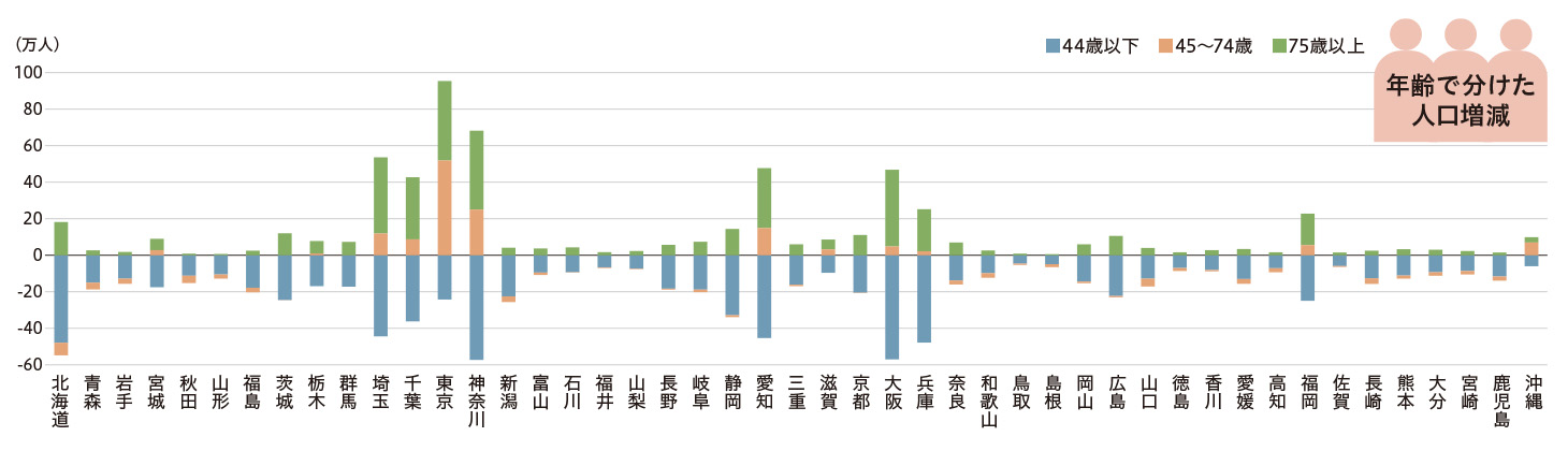 藻谷氏:「若者が戻ってきさえすれば活力が戻る」という発想自体が、もはや時代遅れです。日本全体で0〜9歳の子どもの数は、この50年で6割減りました。2024年までの過去10年間における人口増加は、どの都道府県においてもほぼ高齢者の増加によるものです(図表2)。