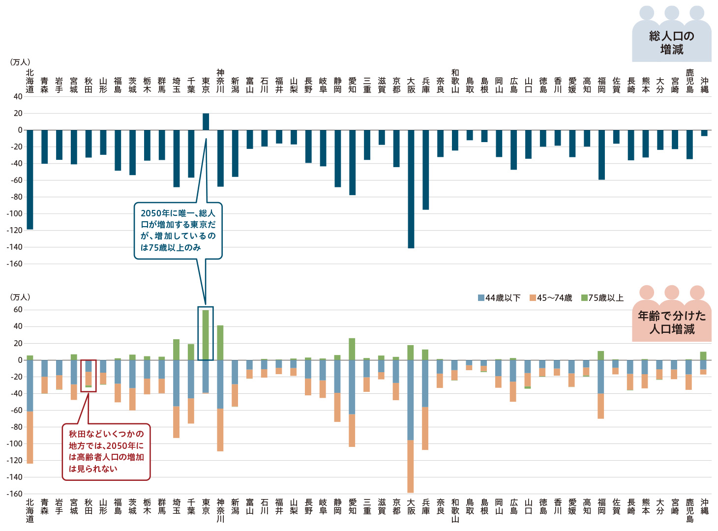 一方、秋田県など現在すでに人口減少が著しい一部の地方では、2050年には高齢者人口が増え終えた状態になります(図表3)。人口減少問題のトンネルを最初に抜けるのは、日本の地方ということです。