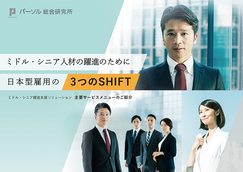 ミドル・シニア人材の課題を解決するために必要な「3つのSHIFT」とはなにか。「3つのSHIFT」を基にした、40〜50代社員からの躍進支援ソリューションをご紹介します。
